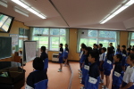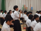 今日は広島県からお越しいただいた船津晶子さんから、被爆体験の伝承講話をききました。船津さんは、被爆2世だそうです。被爆したときの様子をきいたり、絵をみせていただくと子どもたちはショックを受けている様子でした。生徒はみな真剣な表情で船澤さんのお話をきき、それぞれに感じたことを心に刻んでいたようです。