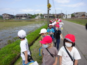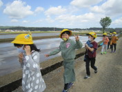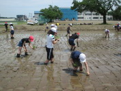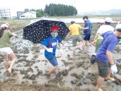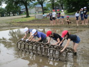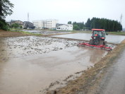 今日は少しの雨模様の中、田んぼの代かきに挑戦しました。 まずは、子どもたちの足で田んぼの土をさらに細かくしかき混ぜました。しかしなかなか人力でははかどりません。 最後に、機械であっという間に代かきが完了し、きれいな田んぼができあがりました。
