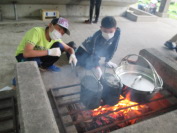 2日目は、野外炊事で飯盒でご飯を炊き、カレーを作って食べました。 天気は雨でしたが、ものともせず、集中してカレーを作りました。かまどもしっかり火を炊き続け、ご飯もおいしく炊き上がりました。 予定通りの日程で、体調を崩すこともなく、決まりよく楽しめました。高学年のよいスタートが切れました。