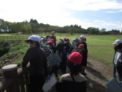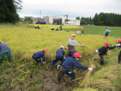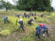 5年生は、学校田の稲刈りをしました。1株ずつ鎌で刈り取っていきました。田んぼがぬかるんでいて、泥んこになってしまいましたが、最後まで、みんなで協力して刈り取りました。刈った稲を束ねるのは、ボランティアの保護者や祖父母の皆様から手伝っていただき、助かりました。刈り取った稲はプールのフェンスに掛けて天日干ししています。
