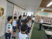 避難訓練を実施しました。今回は、休み時間に火災発生の想定で行いました。子どもたちは、遊んでいた場所で放送の指示を聞き、素早く避難することができました。消防署の方から命を守ることについてのお話をお聞きした後、水消火器体験やスモーク体験をしました。新しい消防車を近くで見せていただくこともできました。