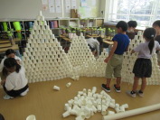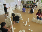 図工で造形遊びをしました。紙コップを重ねたり、並べたり、積み上げたりして、楽しみながら活動しました。イメージをもちながら集中して活動していました。