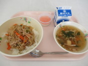 明日は運動会です。今日の給食は、運動会応援献立で、スタミナ丼、ニラの中華スープ、赤白応援ゼリー、牛乳でした。今日の給食で、力がついて、やる気満々の子どもたちです。明日の運動会、頑張りましょう。