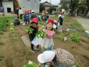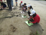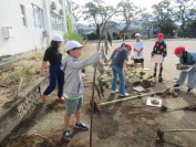 1年生は、さつまいも掘りをしました。みんなで畑の土を一生懸命に掘っていきました。すると紅くて大きなさつまいもが出てきました。傷を付けないように丁寧に掘り上げました。たくさんさつまいもが取れて、大喜びの1年生でした。収穫の後は、さつまいものつるでリースを作りました。後片付けも協力して頑張りました。保護者ボランティアの皆様、ありがとうございました。