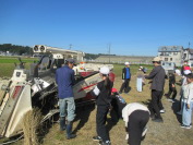5年生は、天日干ししていた稲を外して、コンバインで脱穀してもらいました。コンバインの脱穀の仕組みを見せていただいたり、コンバインの運転席にも乗せていただいたりしました。最後は、落ち穂もみんなでせっせと拾って脱穀しました。さて、今年はどれくらいのお米がとれたでしょうか?