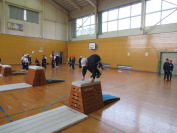 先週は、開脚跳びをやりました。今週は、かかえこみ跳びに挑戦です。いろいろな高さの跳び箱で、向きも縦置きと横置きで練習しました。子どもたちは、自分が跳べそうな跳び箱を選んで、何回も跳んでいました。