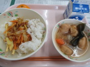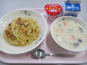 校内読書旬間とのコラボで、今日はお話給食でした。子どもたちに人気の絵本14ひきシリーズの「14ひきのあさごはん」に出てくる「きのこスープ」が献立にありました。カレーピラフ、きのこスープ、ヨーグルト、牛乳、みんなでおいしくいただきました。