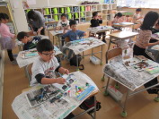 小粟田でたくさんのどんぐりを拾ってきた1年生。どんぐりをリースの飾りにするために、絵の具で色を塗ったり、模様を付けたりしていました。どんな色にしようか考えながら集中して塗っていました。素敵な飾りになりそうです。