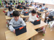 ICTの齋藤先生からおいでいただき、1年生は新しい学習者用端末のiPadにログインしてみました。キーボードの表示を見ながらアルファベットや数字を入力しました。時間が掛かりましたが、みんながログインすることができました。これからいろいろな場面で使っていきます。