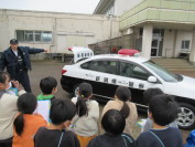 社会の学習で、駐在所長さんからおいでいただき、警察の人の仕事についてお話を聞きました。交通事故や事件を防ぐために、警察の人はたくさんの仕事をしています。子どもたちは話を聞いてメモをしたり質問をしたりしました。授業の最後には、パトカーの中に入っているものやパトカーの中の様子も見せてもらい、説明を聞きました。後部座席にも乗せてもらい嬉しそうな3年生でした。