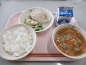 昨日11月24日は、「和食の日」でした。今日のおぢやっ子わくわくメニューのテーマは和食です。献立は、ごはん、かぐら南蛮つくねのもち米蒸し、カリフラワーのサラダ、小千谷の鉄カルみそ汁、牛乳です。小千谷市で採れたおいしいカリフラワーとキャベツのサラダや小千谷で採れたさつまいも、大根、ネギを使ったみそ汁です。小千谷市産のコシヒカリの新米がおいしく食べられる献立でした。