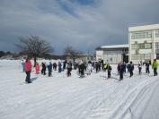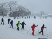 3学期最初のスキー学習です。子どもたちは大喜び。雪の降る中でしたが、グラウンドに出てクロスカントリースキーを行いました。グラウンドのコースをぐるぐる回ってスキーに慣れました。