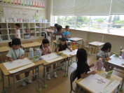 エクシル先生と一緒に外国語活動を行いました。英語で数字と色を聞いて、当てはまるところに色を塗っていきました。元気いっぱいの1年生は、英語の発音も大きな声で、元気にできました。楽しみながら英語に親しんでいます。