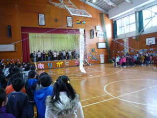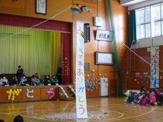 今年1年、片貝小学校を引っ張ってくれた6年生へ感謝の気持ちをこめて、4生は事前準備に垂れ幕やくす玉を作りを頑張りました。