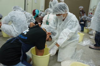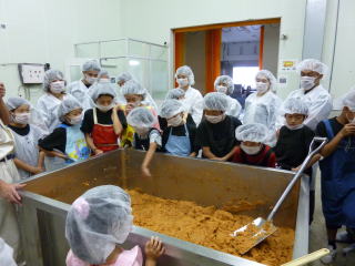 山崎醸造さんでは実際に味噌造りをしてきました。1人4kgという大量の味噌を仕込み、持ち帰ることができました。この味噌は一夏越えた来年の9月〜10月に食べられるそうです。