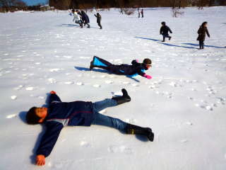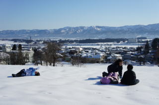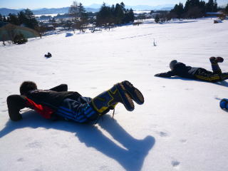雪の上へ座り込み、寝転びすっかりリラックス。