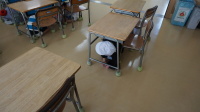 15日(月)に地震・火災を想定した避難訓練を実施しました。緊急放送を聞いて机の下に避難(写真右)し、次の放送の指示でグラウンドに避難しました。