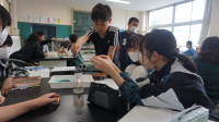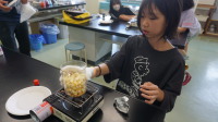 6年生は理科室で実験をしていました。火のついたろうそくをビンの中に入れ、物の燃え方について学習していました。