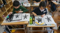 4年生は習字で「羊」を書いていました。座り方、姿勢、筆の持ち方など、基本からしっかりと学習していました。