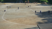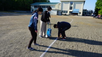 明日からグラウンドで行われるスポフェス練習のために、児童が下校後、先生たちがグラウンドに目印とラインを引いて準備しています。