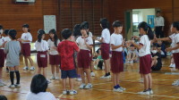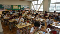 1年生は教室で音楽です。鍵盤ハーモニカで一音一音確認しながら練習をしています。すべての指を使ってひくことが難しかったようです。
