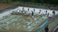56年生は雨の中水泳授業です。天候をものともせずに元気いっぱい泳いでいます。今週末には着衣泳も予定されています。