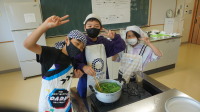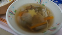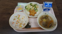 今日の献立は七夕メニューでした。七夕ちらしと七夕汁、星のサラダと星のコロッケ、七夕ゼリーです。七夕汁には星形のかまぼこ、オクラ、短冊をイメージした人参、天の川をイメージしたそうめんが入っていました。星のサラダのチーズはすべて星型、コロッケやゼリーも星型でした。調理に関わっていただいた方に感謝しながらいただきました。