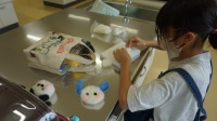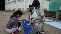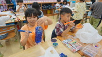 2年生は図工で「ひかりのおくりもの」を制作しています。着色したペットボトルなどを太陽にかざし、地面にカラフルな模様を写すというものです。どの児童も工夫して、色鮮やかなものを制作していました。