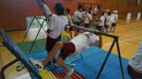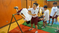 5年生の体育では鉄棒をしています。今日は逆上がりと前方支持回転の練習です。逆上がりは補助具を使用して練習し、少しずつできるようになっています。前方支持回転は難易度が高く、周囲に補助をしてもらっていました。中には単独で成功する児童もいました。みんな頑張っています。