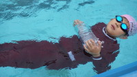 ペットボトルを使って上手に浮く児童や、なかにはペットボトルを使わずに浮く児童もいました。体操着やサンダル等の準備、ありがとうございいました。