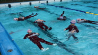 今日は全校で着衣泳「浮いて待て」を実施しました。衣類を身に着けたまま水の中に入った時の体の動かしにくさや重さ、泳ぎにくさ等を実感するとともに、助けが来るまで浮いて待つ練習をしました。