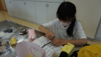 今日は家庭クラブを紹介します。「ニードル」とよばれるマスコットを作成しています。羊毛フェルトを、専用の針で何回も刺すことによって、生地がつながったり膨らんだりして作品になります。お気に入りのマスコットを作るため、フェルトの色を選んだり、根気強く針で刺し続けるなど、集中して作業に取り組んでいます。