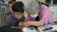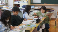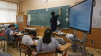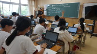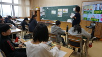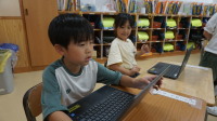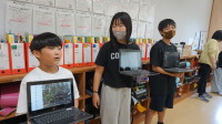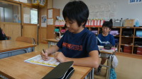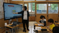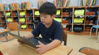 1年生は算数の授業です。課題が早く終わった児童はタブレット端末を使ってドリル学習を進めています。端末の扱いにも慣れてきました。