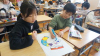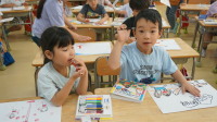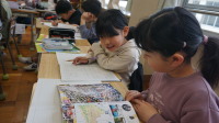 2年生は図工でお絵かきです。画用紙いっぱいに好きなものを描いています。