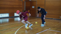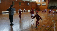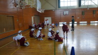 5年生は体育です。ボールを使ったゲームで、短時間で完了させるためにチームで話し合って工夫しています。