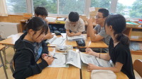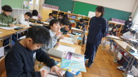 5年生は国語で、漢字を使って文章を書く練習をしています。班で協力して進めています。
