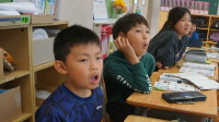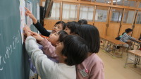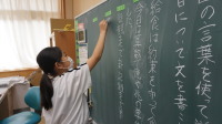 4年生は国語で、黒板に掲示された文章について、深く理解しようとしています。みんなとても真剣です。