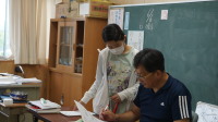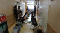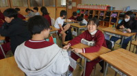1年生は検査のために教室で並んでいます。検査場では私語をせず、静かに待機できています。立派です。