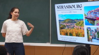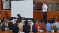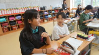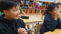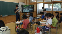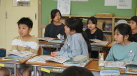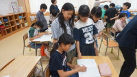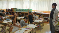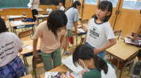 6年生は留学生と一緒に海外のことを学んでいます。写真を見ながら、日本との違いを感じていました。