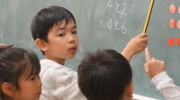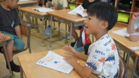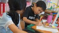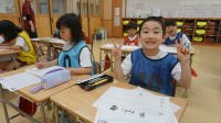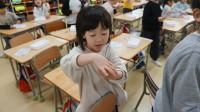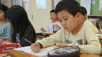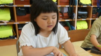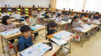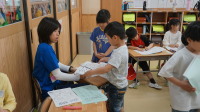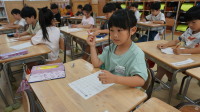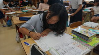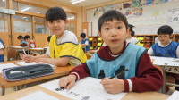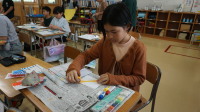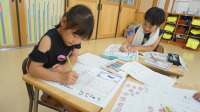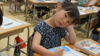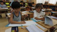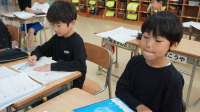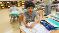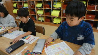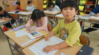 1年生は算数で数字を書く練習をしています。見本どおりに正しく書こうと頑張っています。