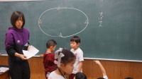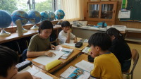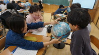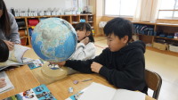 5年生は地球儀を使って緯度や経度の学習をしています。実物模型を使うとわかりやすいようです。