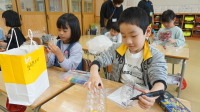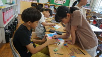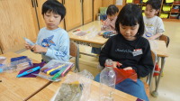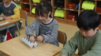 2年生は図工で光る作品をつくっています。ペットボトルや卵の容器を着色して光にかざします。