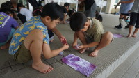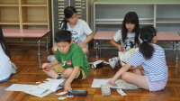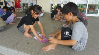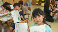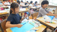 1年生は育てたアサガオの花を使って、染め物をしています。鮮やかな色が出ています。