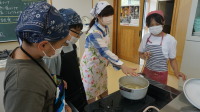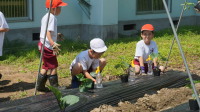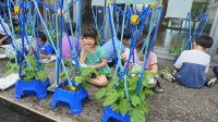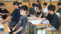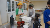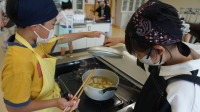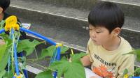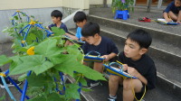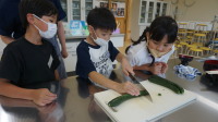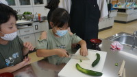 2年生は自分たちが育てた野菜を使って調理実習です。立派に育ったキュウリを切っています。他にもナスやピーマンなど、たくさん収穫できています。