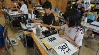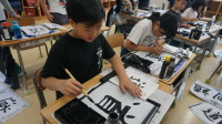 3年生は書写の時間です。今日は水で「下」という字を書いています。とても上手にかける子もいます。