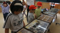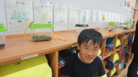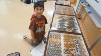 調理員の石曽根さんが提供してくれた蝶の標本を展示中です。珍しい蝶がたくさん展示してあり、子どもたちも興奮しています。中には、ノートに書き写す子もいました。