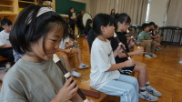 6年生は音楽でリコーダーのテストしています。二人一組で行っています。待っている児童は理科室で練習しています。楽しそうです。