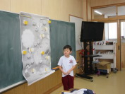 4年生は自分で作ったビー玉遊びの工作について、振り返りをしています。ピタゴラスイッチのようです。