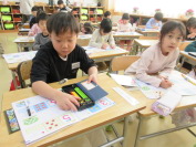 1年生はさんすうで、授業に使う学習教具を確認しています。頭だけでなく、視覚も使って効果的に学習を進めます。