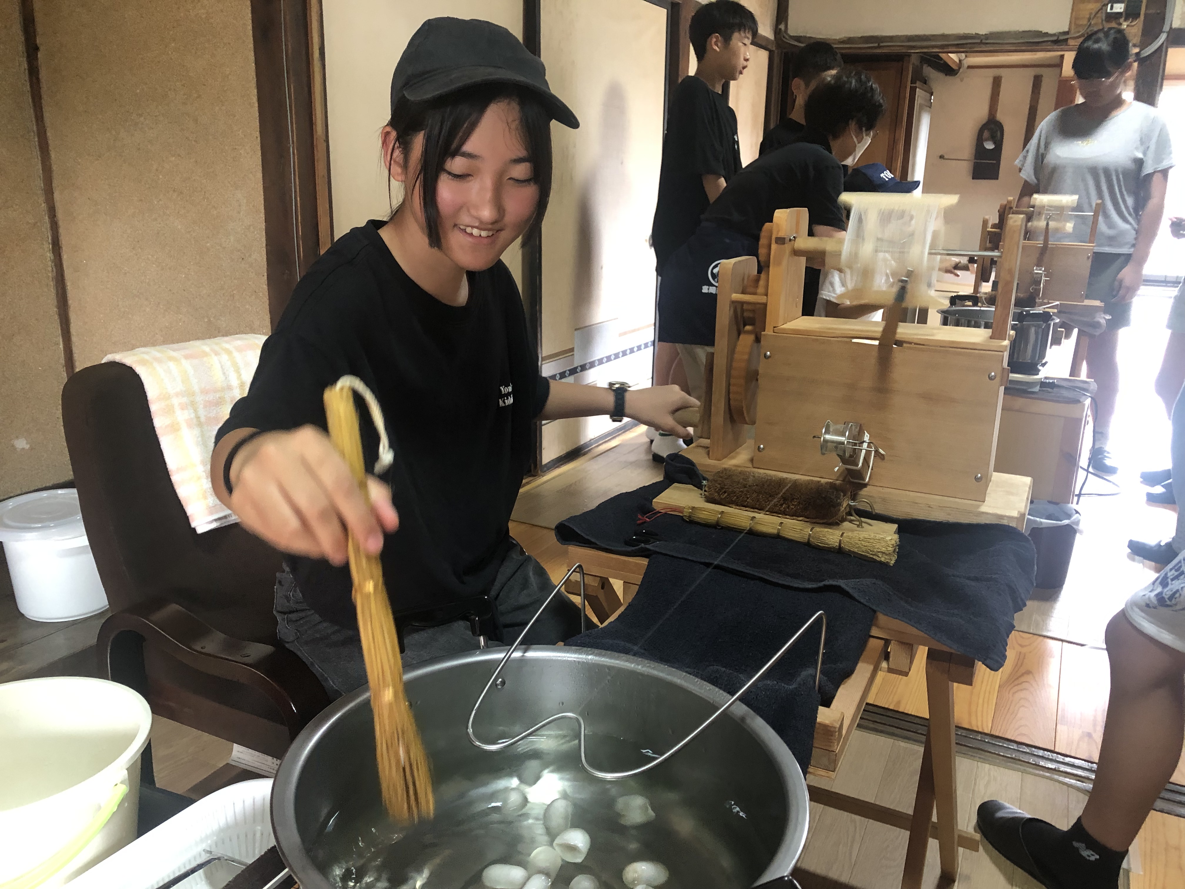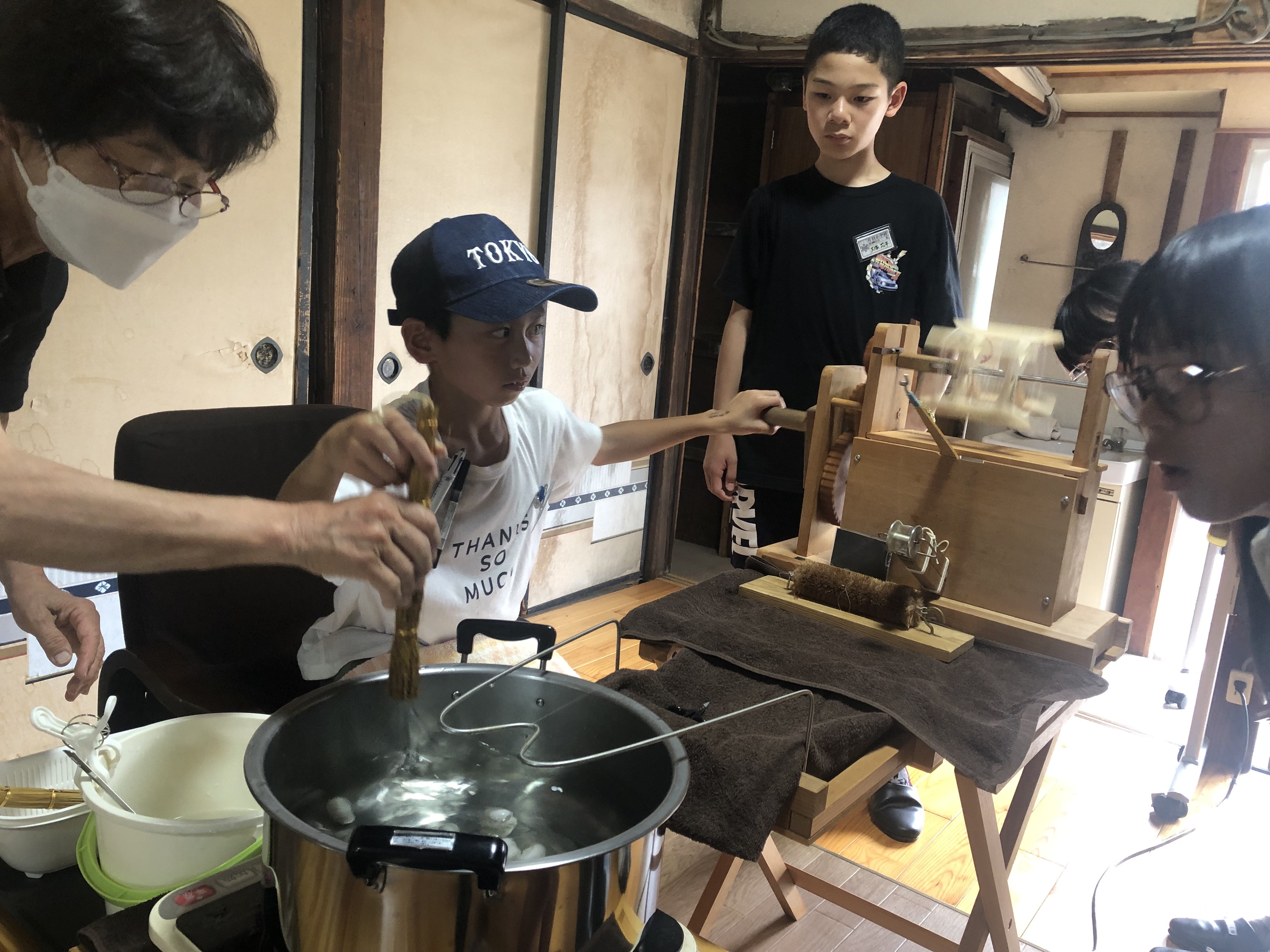 座繰り体験中です。初めての体験でみんな興奮しています。